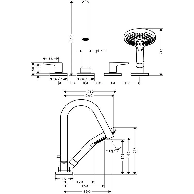- Consists of: 3-hole tile mounted bath mixer, hand shower, shower holder