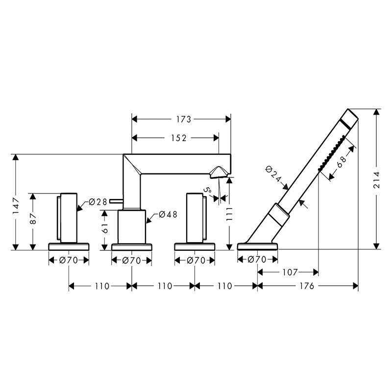 - Consists of: 4-hole rim-mounted bath mixer, hand shower, Secuflex hose set, shower holder